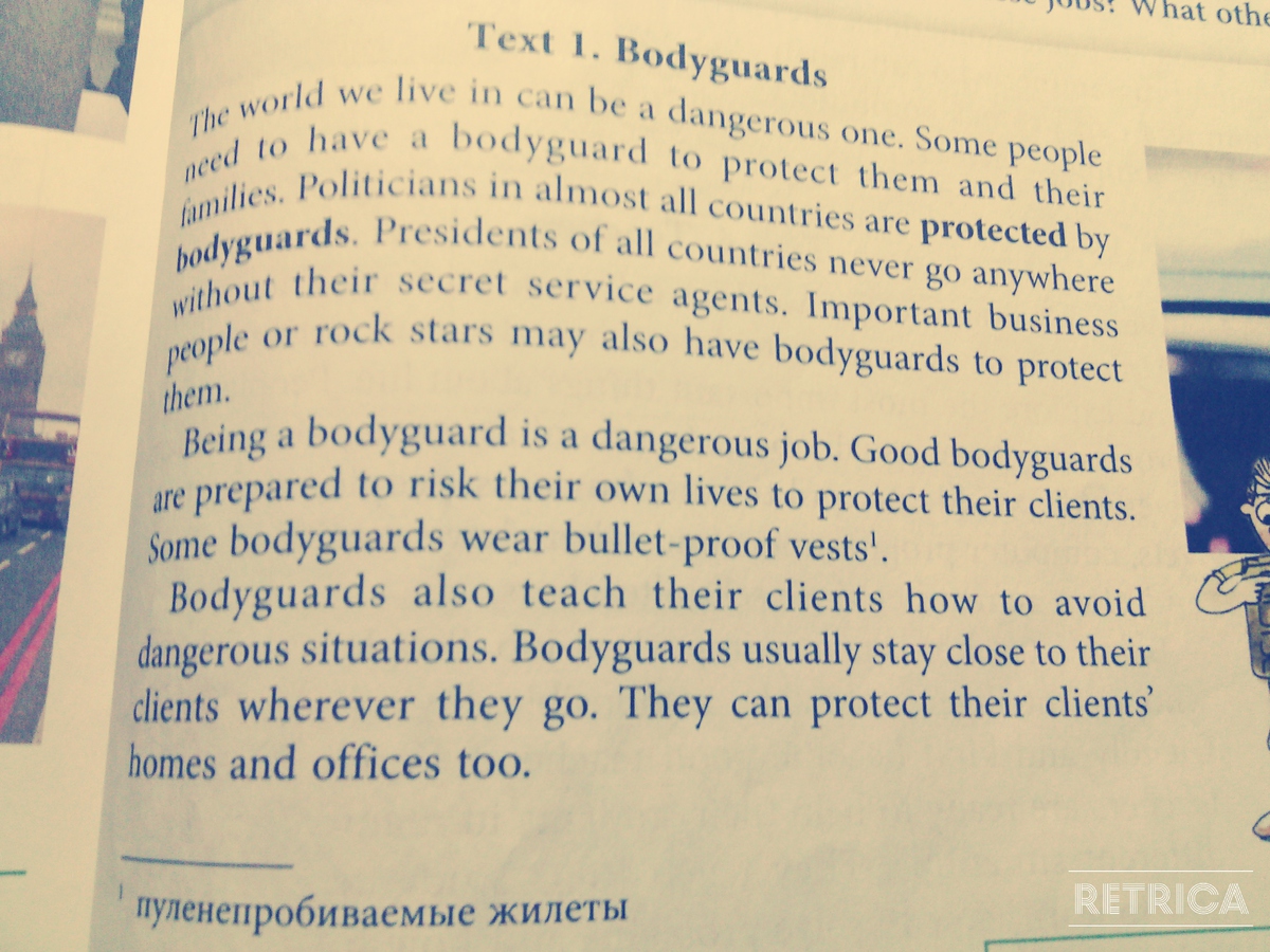 Мир, в котором мы живем, может быть опасным. У некоторых людей должен быть телохранитель, чтобы защитить их и их семьи. Политики в почти странах высокого звука охраняются телохранителями, президент Соединенных Штатов никогда не идет никуда без Агентов Секретной службы. У важных деловых людей или рок-звезд могут также быть телохранители, чтобы защитить их. Телохранитель - опасная работа. Хорошие телохранители образуют дугу подготовленные рискнуть их собственными жизнями, чтобы защитить их клиентов. Некоторые телохранители носят бронежилеты.