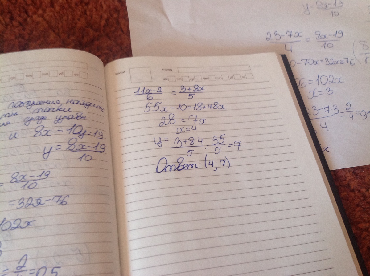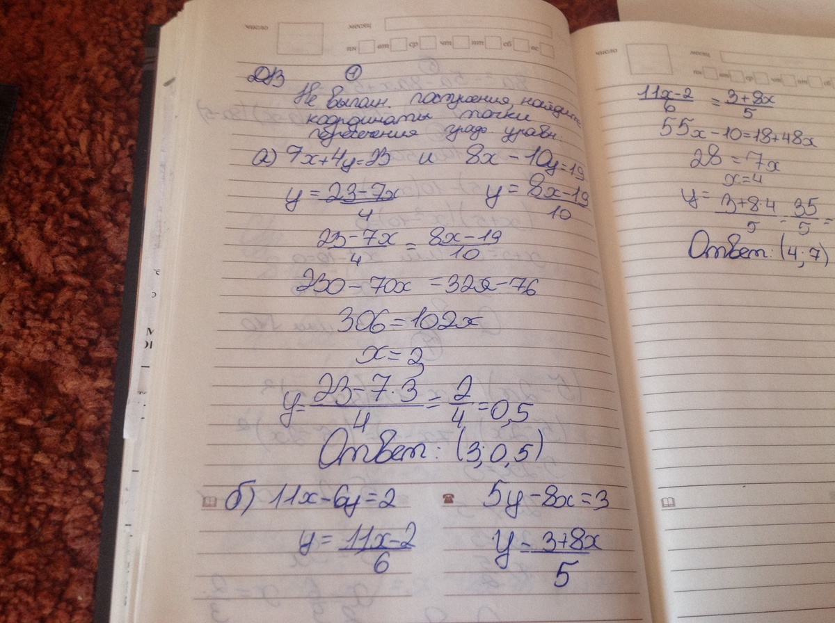 Не выполняя построения,найдите координаты точки пересечения графиков уравнений: А) 7x+4y=23 и 8x-10y=19 Б)11x-6y=2 и -8x+5y=3 Пожалуйста решите подробно и немного обьяснения :)