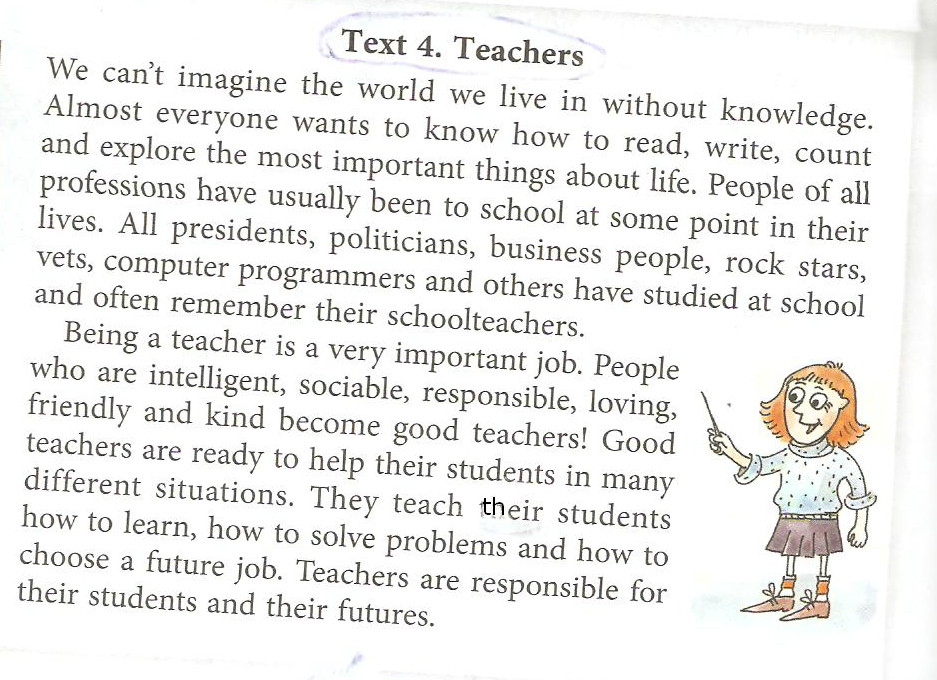Текстовые 4. Учителя Мы не можем представить себе мир в котором мы живем, не зная. Почти каждый хочет знать, как читать, писать, считать и изучить самые важные вещи о жизни. Люди всех профессий, как правило, ходили в школу в какой-то момент в их жизни. Все президенты, политики, бизнесмены, рок-звезды, ветеринары, программисты и другие изучали в школе и часто вспоминаю их школьных учителей. Будучи учитель очень важная работа. Люди, которые умный, общительный, ответственный, любящий, дружелюбный и добрый стать хорошими учителями! Хорошие учителя готовы помочь своим студентам я многих различных ситуациях. Они учат своих студентов, как учиться, как решать проблемы и как выбрать будущую работу. Учителя несут ответственность за своих студентов и их будущее.
