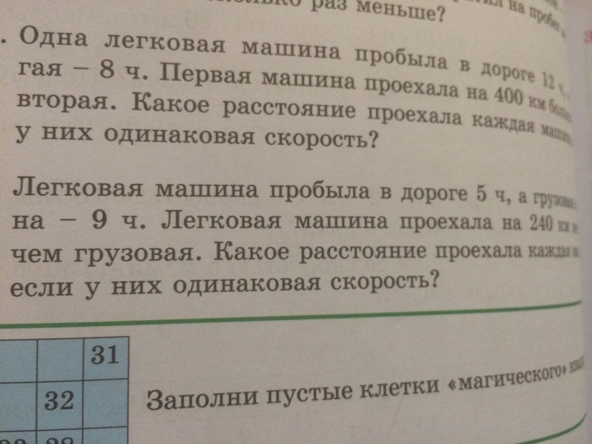 1 задача: 12-8=4(на 4 часа больше была в пути 1 машина) 400:4=100(км/час) скорость машин 100*12=1200(км) проехала 1 машина 100*8=800(км) проехала 2 машина 2 задача; 9-5=4(на 4 часа больше грузовая машина) 240:4=60(км/час) скорость машин 60*9=540(км) проехала грузовая машина 60*5=300(км) проехала легковая машина