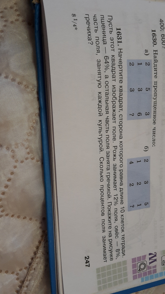 начертите квадрат сторони которого равна длине 10 клеток. пусть это будет поле. рожь занимает 12% поля, овес 8%, пшеница 64%, а остальная часть поля занята гречихой. покажите на рисунке каждую культуру. сколько процентов поля занимает гречиха?