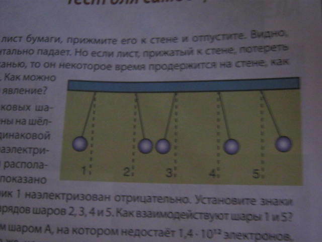 По рисунку видно, что 1 шарик отталкивается от 2, значит 2 шарик заряжен отрицательно.3 шарик притягивается ко 2, значит знак противоположный те положительный.4 шарик отталкивается, значит положительный.5 шарик отталкивается от положительного, значит тоже положительный.1 и 5 притягивабтся, тк имеют разные знаки2-3+4+5+