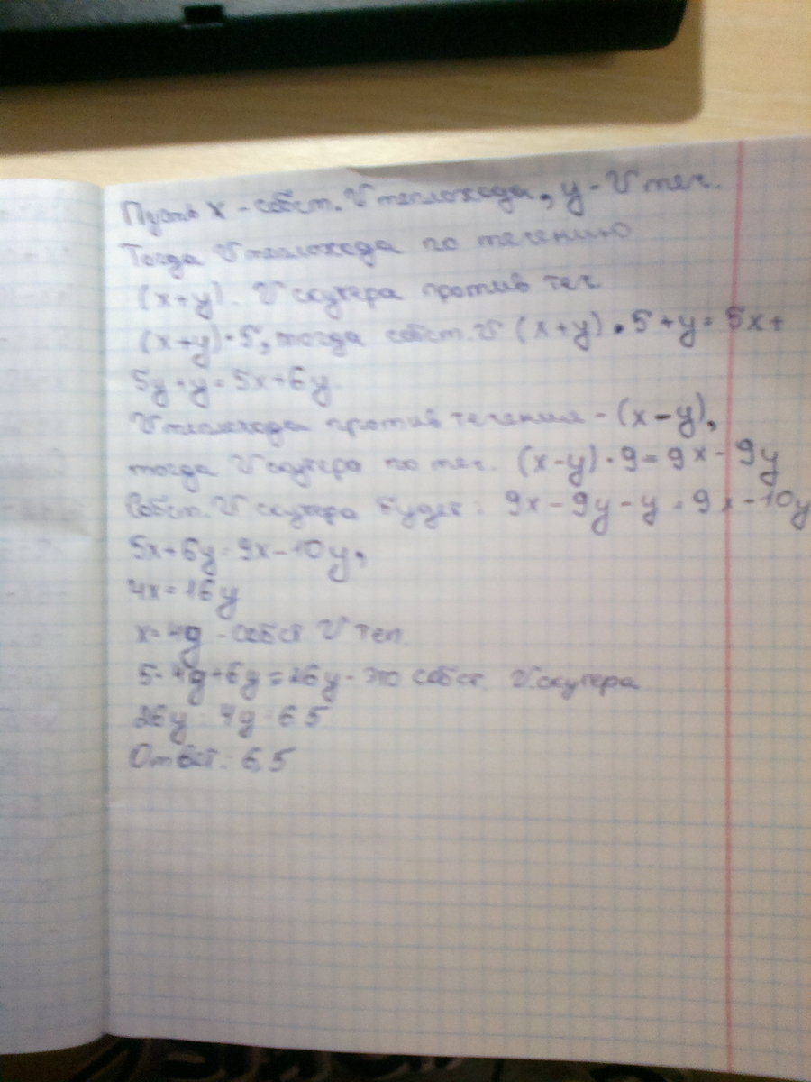 теплоход идёт по течению реки в 5 раз медленнее, чем скутер против течения, а по течению скутер идёт в 9 раз быстрее,чем теплоход против течения. во сколько раз собственная скорость скутера больше собственной скорости теплохода?