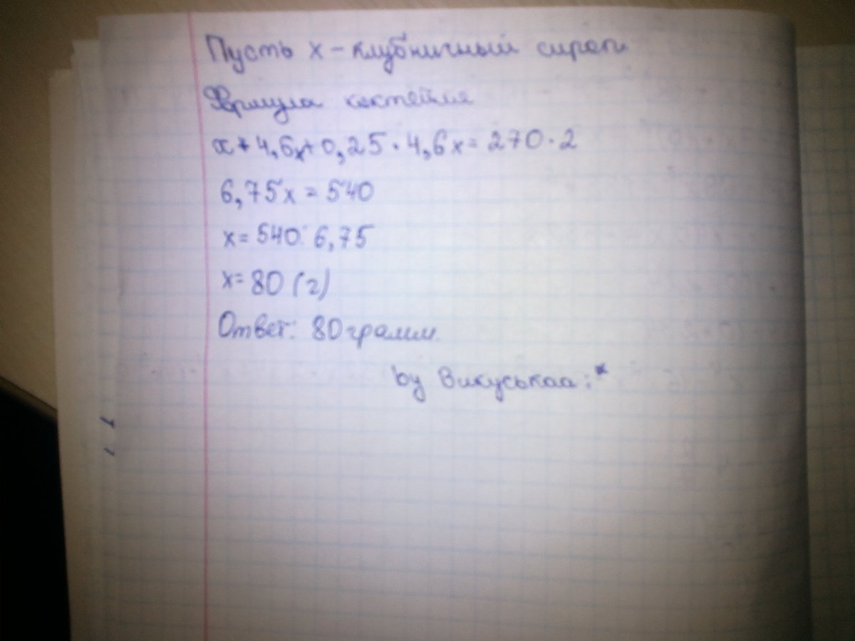 Для приготовления коктейля используется молоко, ванильное молоко и клубничный сироп. Молока должно быть на 460% больше, чем клубничного сиропа, а мороженого на 25% меньше, чем молока. Сколько граммов клубничного сиропа требуется для приготовления двух порций этого коктейля массой 270 граммов каждая?