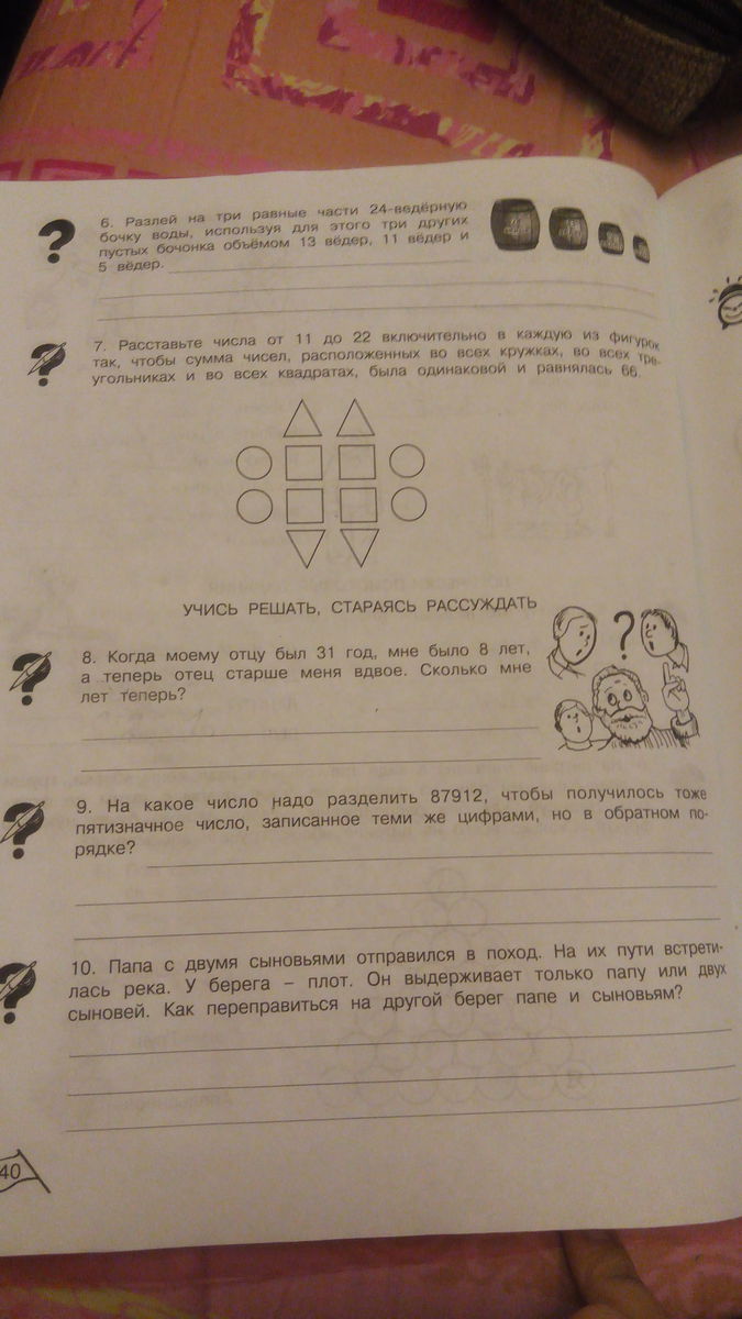 10.Сперва едут дети,возвращается один,остаётся на том берегу,едит папа,с того берега возвращается один мальчик содятся два мальчиеа на плот и возвращаются к папе.8.Тогда ты родился, отцу было 31-8=23года, старше в два раза он будет 23х2=46 лет ему и 23 - тебе