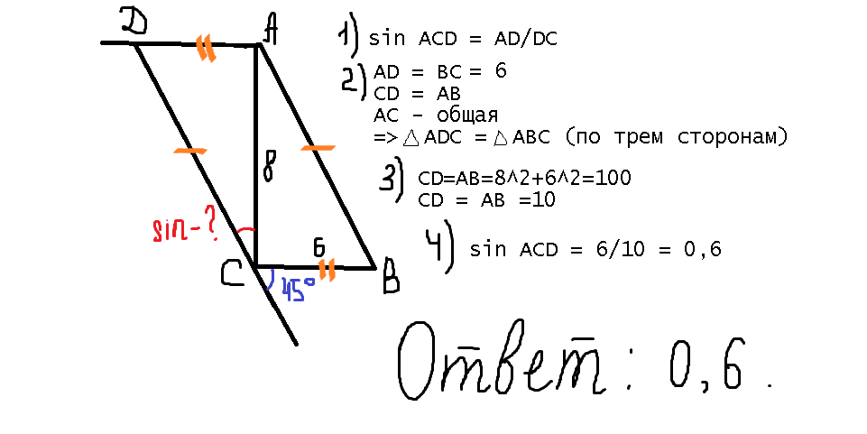 Пожалуйста решите кто знает. Катеты CA и CB прямоугольного треугольника ABC равны 6 см и 8 см.Через вершину C проходит плоскость,параллельная AB.Меньший катет треугольника образует с этой плоскостью угол в 45°.Найдите синус угла,который образует с ней другой его катет.