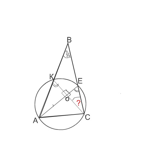 Окружность проходит через вершины А и С треугольника АВС и пересекает его стороны АВ и ВС в точках К и Е соответственно. Отрезки АЕ и СК перпендикулярны. Найдите угол КСВ, если угол АВС = 20градусов.