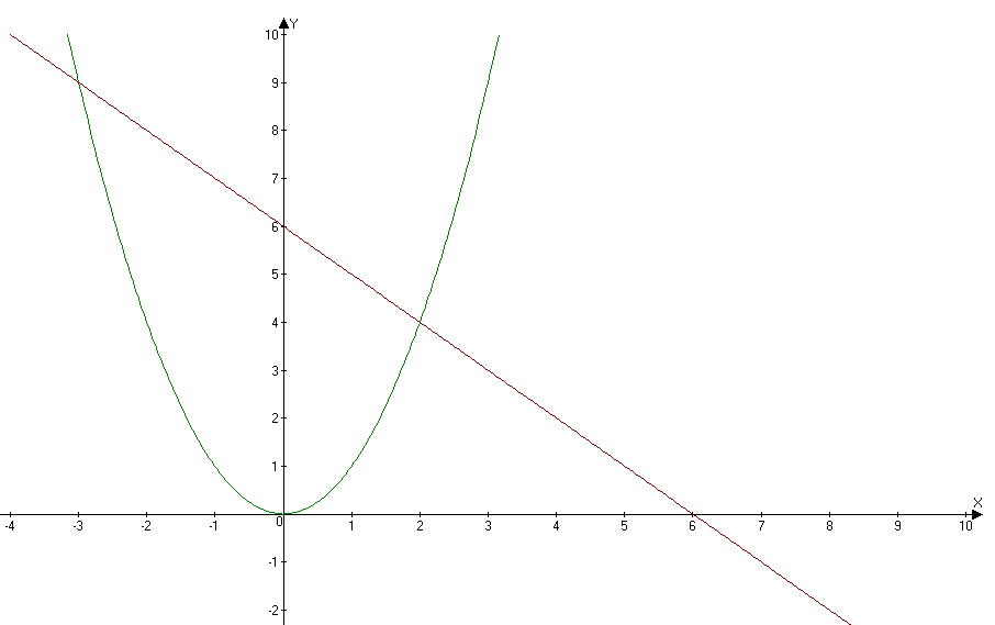 Рассмотрим функции f(x) = x² (парабола, ветви направлены вверх) и g(x) = -x+6 (график прямая, проходящая через точки (0;6); (6;0)