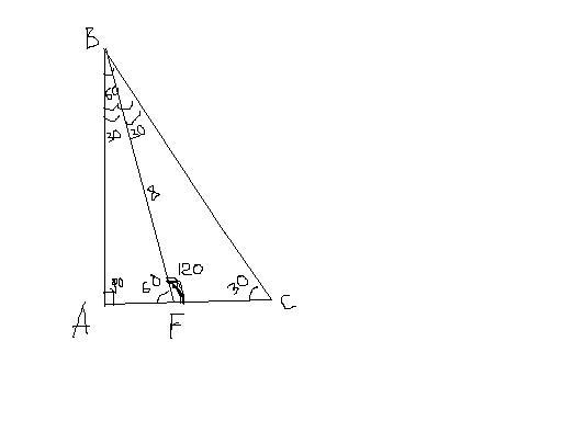 В треугольнике АВС биссектриса разделила угол В на два угла по 30 градусов, т.к. биссектриса делит угол пополам.В прямоугольном треугольнике ABF катет АF лежащий против угла в 30 градусов, в половину меньше гипотенузы BF, т.е он равен 8/2=4. Треугольник FBC является равнобедренным т.к углы при основании ВС равны по 30 градусов, значит стороны FB и FC равны по 8 см. Значит катет АС равен 4+8=12 см. Думаю так..