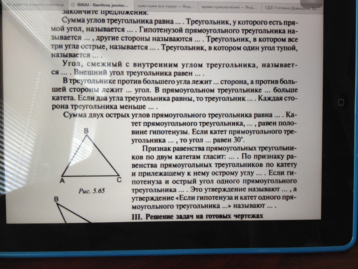сумма= 180 градусов, называется прямоугольным, гипотенузой называется сама гипотенуза, ( это тупо, но да),другие стороны это катеты, острые углы это остроугольный треугольник, а один тупой угол - тупоугольный, угол смежный с внутренним - внешний, и он равен сумме углов не смежных с ним, против большего угла лежит большая сторона., а против большей стороны больший угол, в прямоугольном треугольнике гипотенуза больше катета, если 2 угла равны треугольник равнобедренный, основания, сумма = 90 градусов, катет прямоугольного треугольника лежащий против угла в 30 гр. = половине гипотенузы, равен половине гипотенуза , то угол напротив его = 30 гр, если катеты одного треугольника, равны катетам другого треугольника , то треугольники равны по двум катетам, и т.д