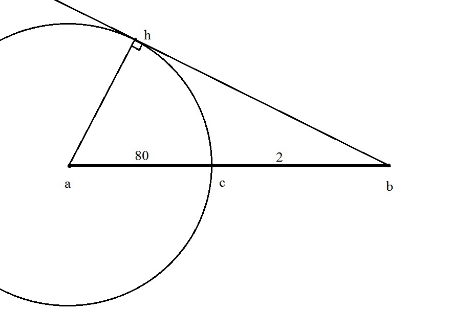 на отрезке ab выбрана точка c так , что ac =80 и bc=2 . построена окружнасть с центром a , проходящая через c . найдите длину отрезка касательной проведенной из точки b к этой окружности