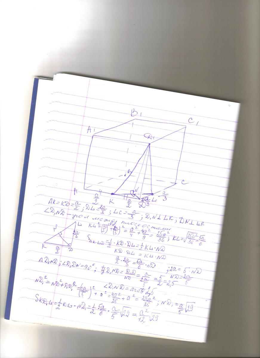 В кубе ABCDA1B1C1D1 точка K-середина ребра AD, точка L принадлежит СD и CL:LD=1:2. Через точки К, L и D1 проведена плоскость. Найдите угол между плоскостями KLD1 и АВС, а также площадь полученного сечения, если ребро куба равно а