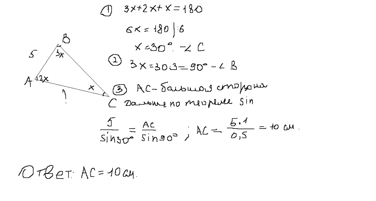 Углы треугольника относятся как 2:3:1, а меньшая сторона его равна 5. Найдите большую сторону треугольника.