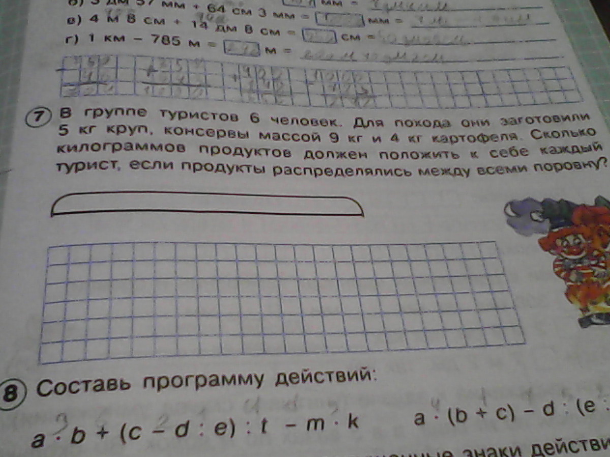 в группе туристов 6 человек. Для похода они заготовили 5кг круп, консервы массой 9 кг и 4 кг картофеля . Сколько килограммов продуктов должен положить каждый к себе каждый турист, если продукты распредилялись между всеми поровну?