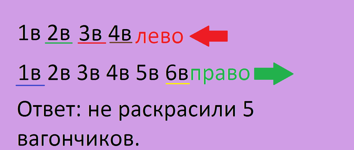подчеркни:певый вагон справа- синим цветом,второй слева_зеленым,четвертый слева- коричневым,шестой справа- желтым,между зеленым и коричневым-красным.сколько вагончиков не раскрасили?
