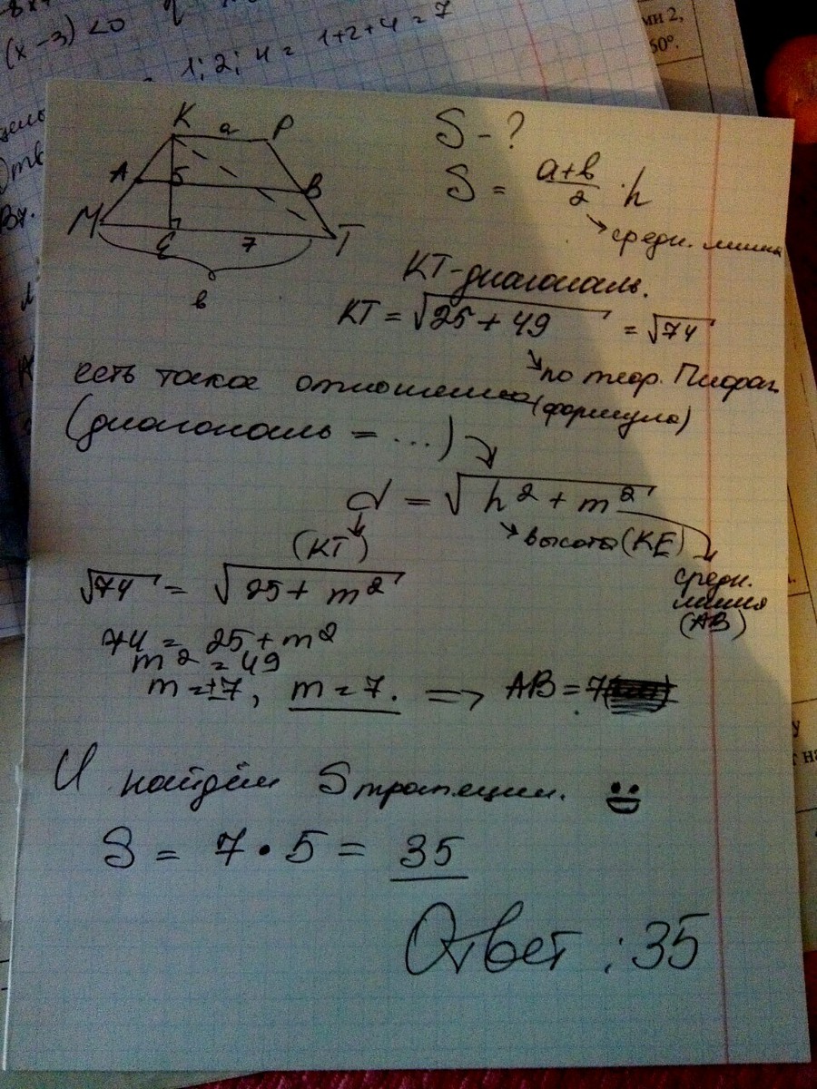 найдите площадь равнобокой трапеции мкрт если длина ее высоты ке равна 5, а точка е разбывает основание мт на отрезки длина большего из которых равна 7