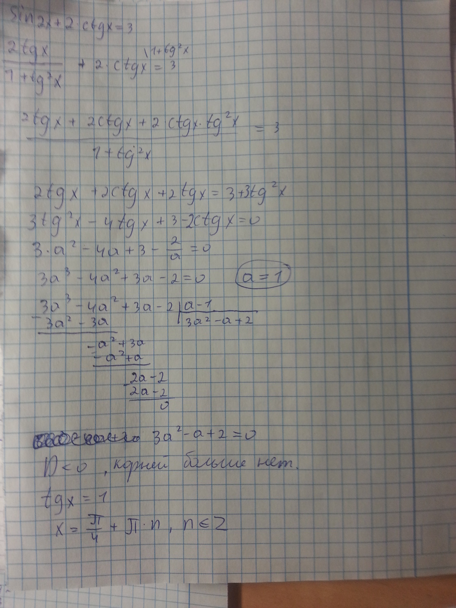Методом универсальной подстановки переходим от синуса к тангенсу. Приводим к общему знаменателю, перебрасываем в одну часть, помня, что tgx*ctgx=1 переходим непосредственно к тангенсу. Заменяем tgx=a , подбором находим 1 корень и делим. Получается квадратное уравнение с дискриминантом меньше 0. Значит корень 1.