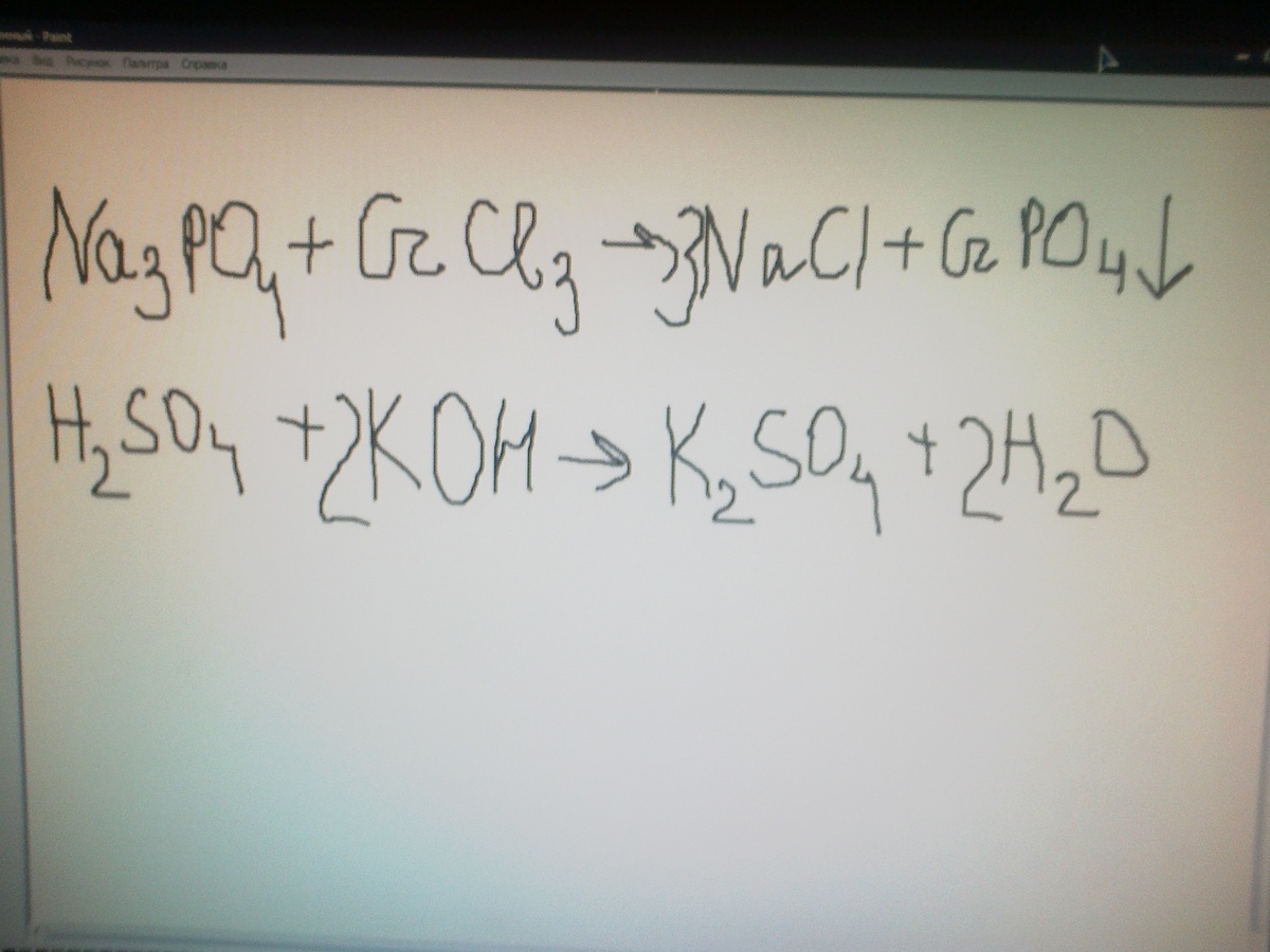 Реакция ионного обмена между фосфатом натрия и хлоридом хрома (III), между сульфатной кислотой и гидроксидом калия.
