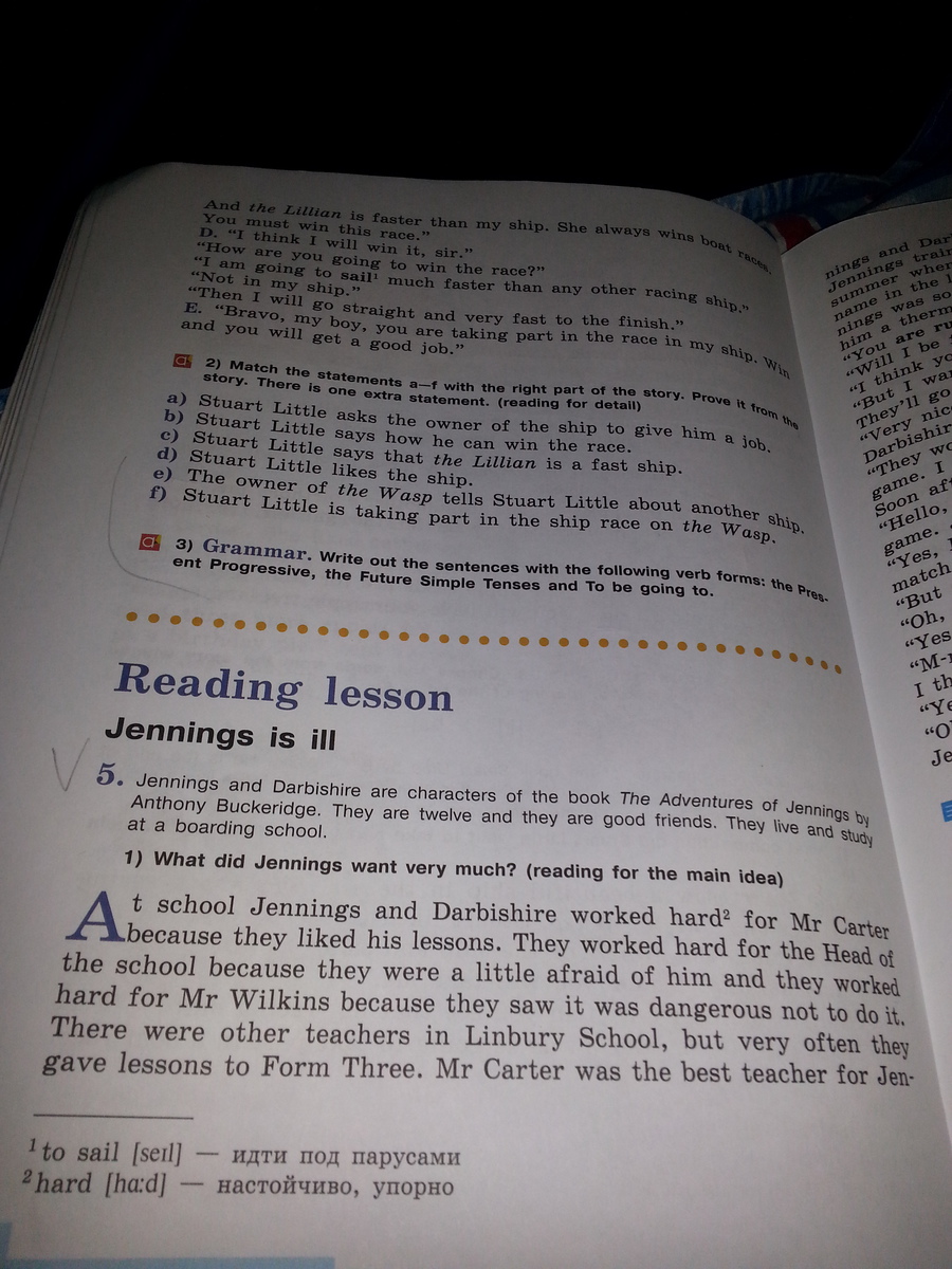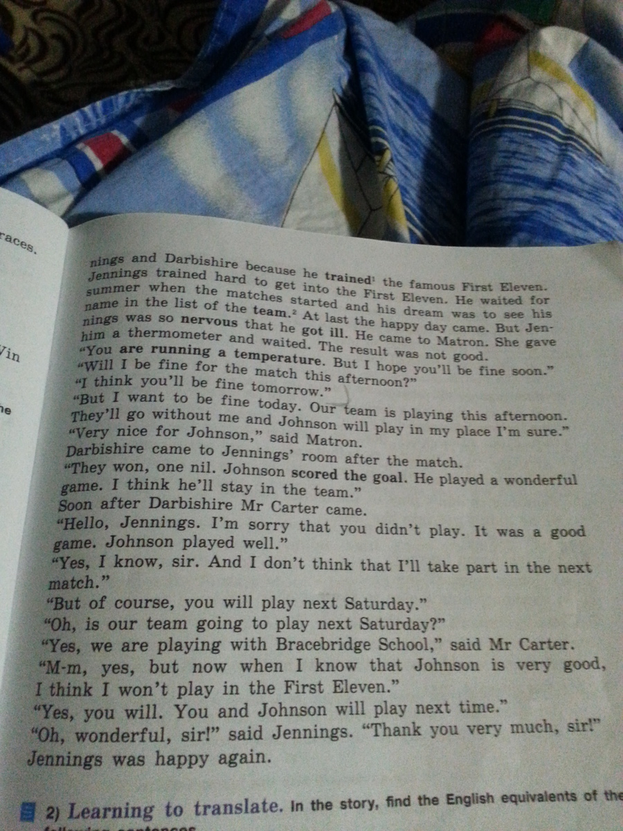 В школе Дженнингс и Дарбишир трудились для мистера осторожностью, потому что они любили его уроки. Они трудились для прислушаться к школе, потому что они были немного боялись его, и они у нас трудно для г-на Wilkins, потому что они видели, было опасно не делать Были и другие учителя в школе Linbury. но очень часто давал уроки образуют три. Г-н Картер был лучшим учителем для Джи Дарбишир, потому что он тренировался знаменитый одиннадцать: тренировался, чтобы попасть в Фират Eleven. Он ждал, когда начал ER матчи и его мечтой было увидеть свое имя в списке команды. Наконец счастливый день пришел. Но Джен так нервничал, что он заболел. Он пришел к Matron- она дала градусник и стали ждать. Результат не было хорошо. Вы работаете в, но я надеюсь, что вы будете ане soon- я в порядке к матчу во второй половине дня? думаю, вам будет хорошо завтра. "Но я хочу, чтобы хорошо сегодня. наш играет во второй половине дня. Они пойдут без меня и Джонсон сыграет на моем месте, я уверен, что" Очень хороший для Джонсона сказал Матрона. Дарбишир пришли в комнату Дженнингса после матча. "Они выиграли, один ноль. Джонсон забил гол. Он играл н выиграл игру. Я думаю, что он останется в команде в ближайшее время после прихода Дарбишир Картер. Привет, Дженнингс. Мне жаль, что вы не играть. Это был хороший Джонсон играл хорошо ". игра. .Yes, Я знаю, сэр. И я не думаю, что ри принять участие в следующем матче Но, конечно, вы будете играть в следующую субботу. "" О, это наша команда будет играть в следующую субботу? "Школу", сказал г-н Картер "Да, мы играем с Брейсбридж "Мм, да, но теперь, когда я знаю, что Джонсон очень хорошо, думаю, я не буду играть в первых одиннадцати." "Да, вы будете. Вы и Джонсон сыграет в следующий раз. "" Спасибо вам большое, сэр! ", Сказал Дженнингс," О, замечательно, Дженнингс снова был счастлив.