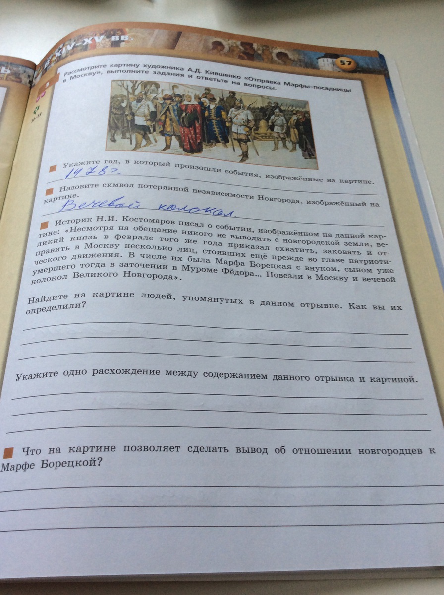 Марфа Борецкая и её внук, находятся в центре картины и идут под охраной