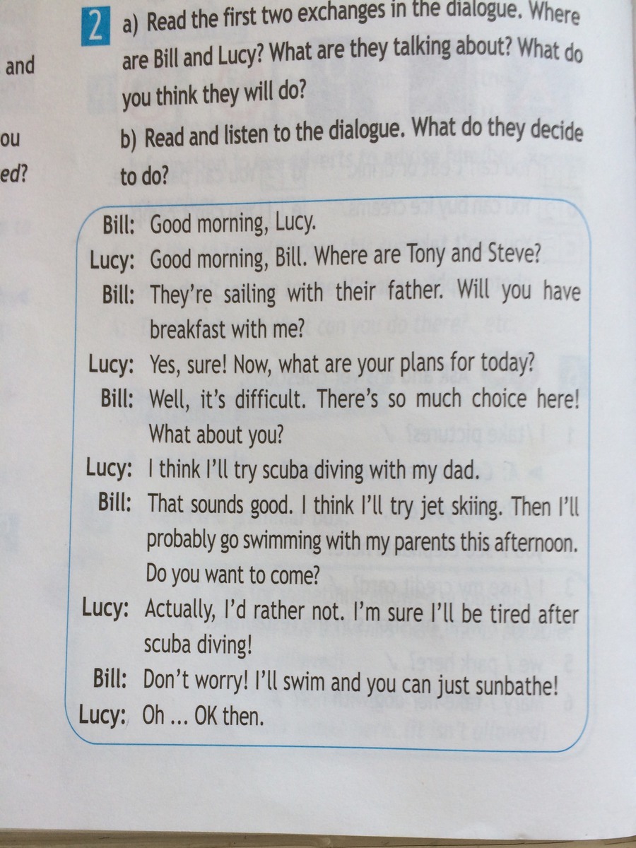 Билл: это звучит круто. я думаю попробовать покататься на водных лыжах. А потом возможно пойду плавать с родителями после обеда. Хочешь пойти?