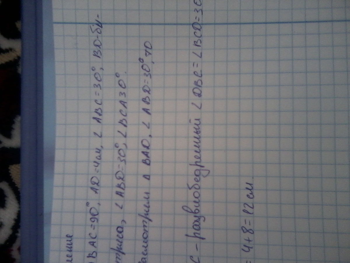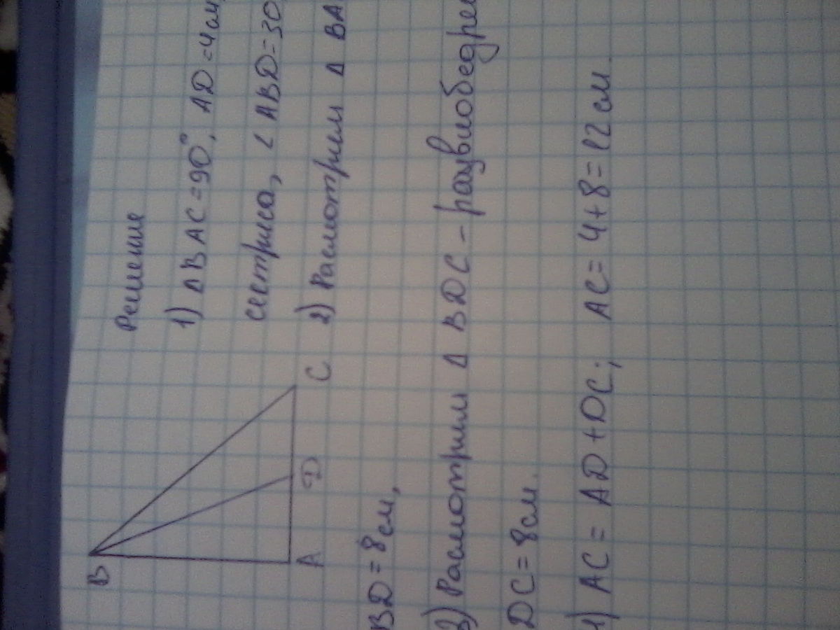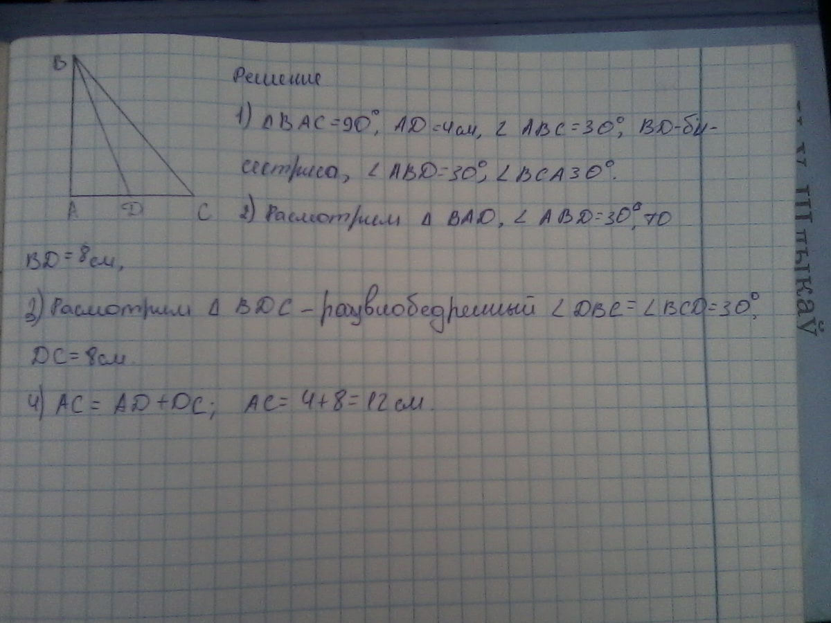 Помогите пожалуйста! треугольнике АВС угол А равен 90 градусов, а угол В равен 60, на стороне АС отмечена точка D так, что угол DBC равен 30 градусов. DA=4см. Найти АС и расстояние от точки D до стороны ВС