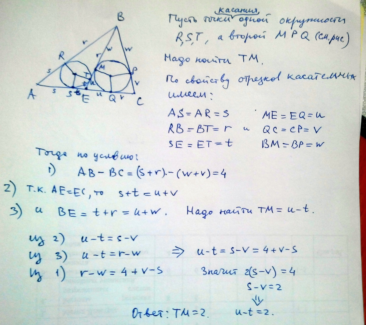 Что имею-отдаю.Помогите,пожалуйста!С помощью чего решить?В треугольнике АВС сторона АВ на 4 больше стороны ВС.Медиана ВЕ делит треугольник на два треугольника.В каждый из этих треугольников вписана окружность.Найдите расстояние между точками касания окружностей с медианой ВМ