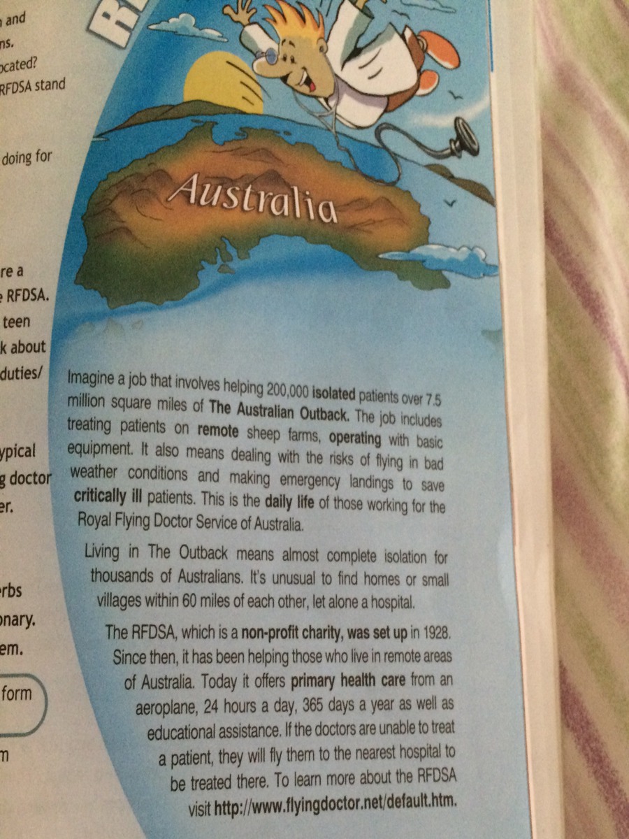 КПСДА (the RFDSA) - это некоммерческая благотворительная организация, основанная в 1928 году. Еще с 1928 года эта организация помогает людям, живущим в отдаленных регионах Австралии. Сегодня она предлагает как первую медицинскую помощь с самолетов 24 часа в сутки, 365 дней в году, так и педагогическую, просветительскую помощь. И если доктора не могут помочь пациенту, они летят с ними до ближайшей больницы, где им будет оказана помощь. Чтобы получить больше информации о КПСДА (the RFDSA), зайдите на сайт flyingdoctor.net/default.htm.