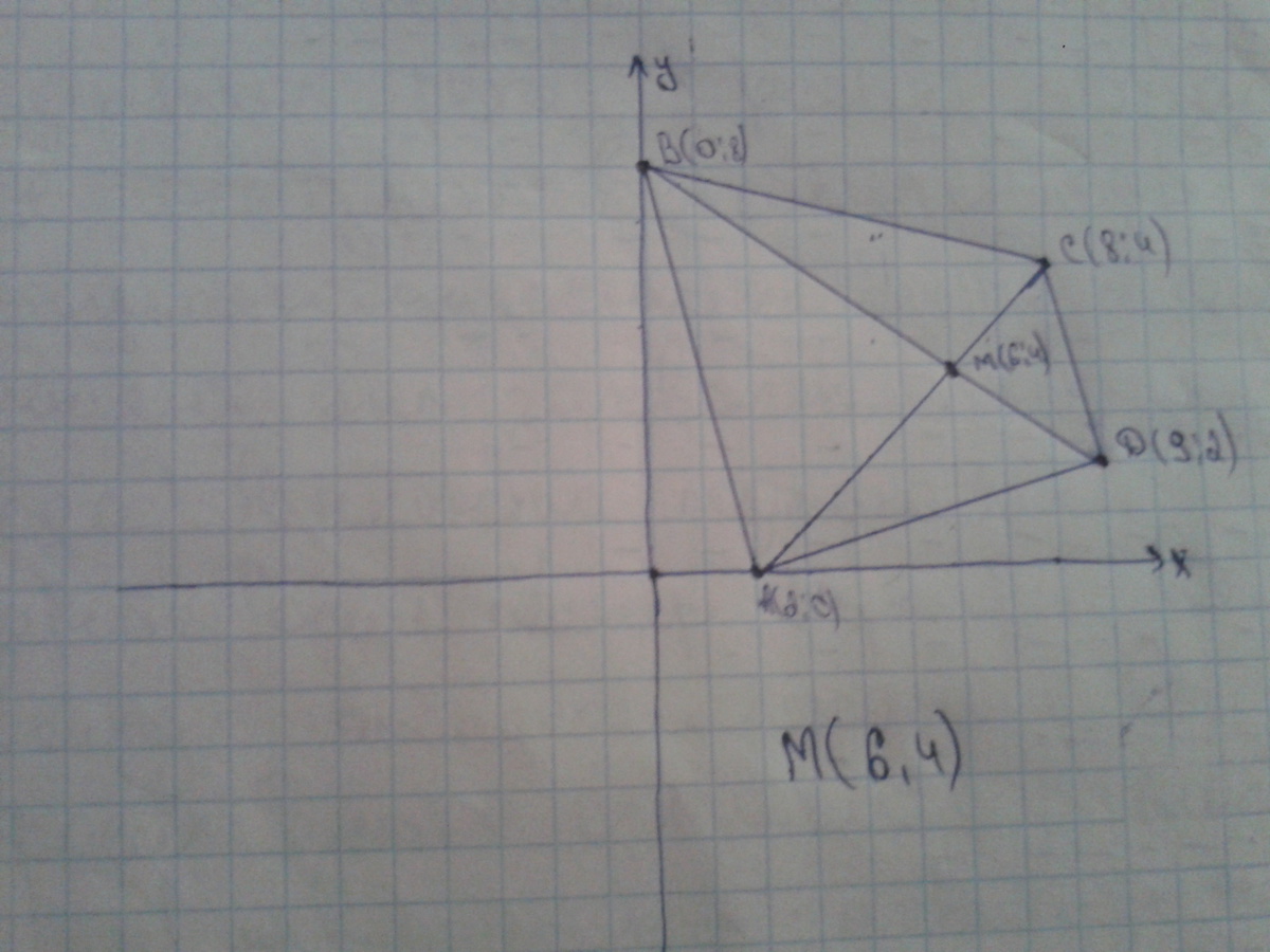 Построй четырехугольник ABCD по координатам его вершин. Проведи диагонали AB и CD и найди их точки пересечения M. A(2,0). B (0,8). C(8,6). D( 9,2). M( , )