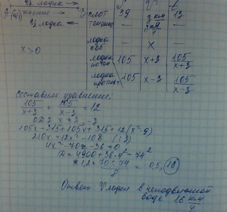 Расстояние между пристанями А и В равно 105 км. Из А в В по течению реки отправился плот, а через час вслед за ним отправилась моторная лодка, которая, прибыв в пункт В, тотчас повернула обратно и возвратилась в А. К этому времени плот прошёл 39 км. Найдите скорость лодки в неподвижной воде, если скорость течения реки равна 3 км/ч.