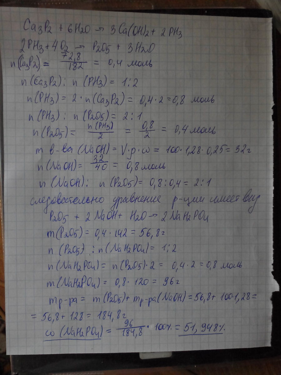 Фосфид кальция массой 72,8г реагирует с водой с образованием гидроксида кальция и фосфористого водорода (фосфина). Полученный газ сжигают, а