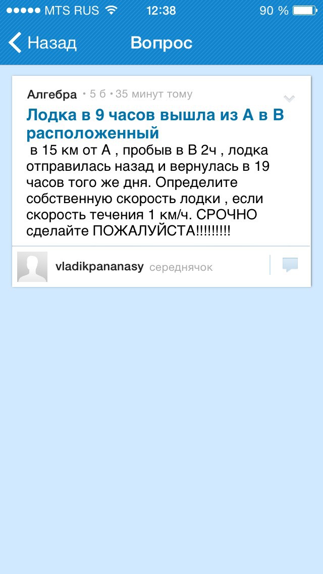 Пусть скорость лодки - х км/ч, тогда расстояние от А до В лодка прошла за 15/(х+1) часов, а обратно за 15/(х-1) часов. Всего в пути лодка была 19 - 9 = 10 (часов). Получаем уравнение