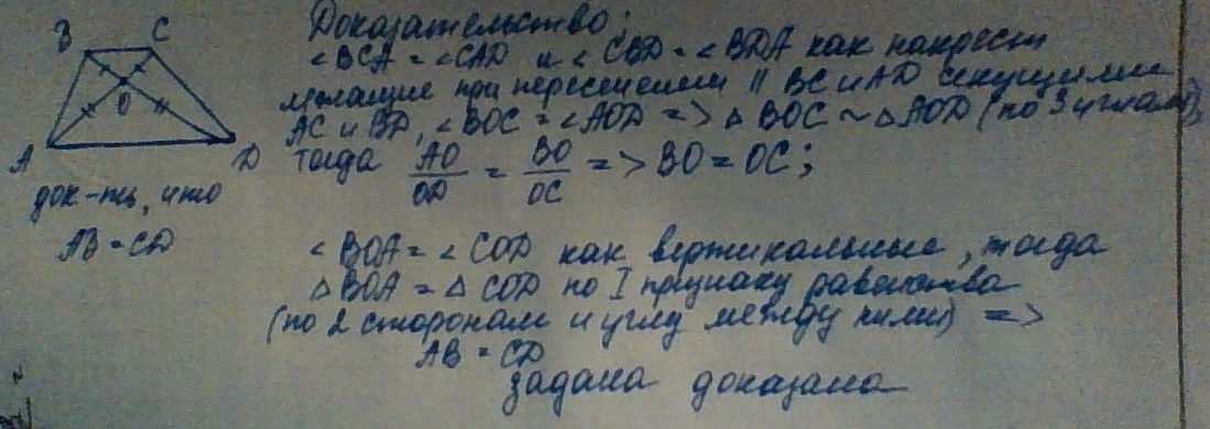 Стороны ВС и АD четырёхугольника АВСD параллельны. Диагонали точкой пересечения делятся на четыре отрезка, два из которых, принадлежащие разным диагоналям и примыкающие к одной из параллельных сторон, равны между собой. Докажите, что стороны АВ и СD равны.