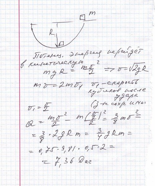 Маленький кубик массы m начинает скользить без трения по цилиндрической выемке радиуса R. Начав движение сверху, он сталкивается с другим таким же кубиком, покоящимся внизу. Чему равно количество теплоты, выделившееся в результате абсолютно неупругого удара?