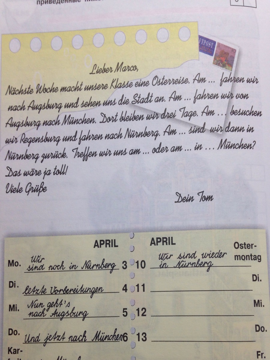 ОЧЕНЬ НУЖНА ПОМОЩЬ ПО НЕМЕЦКОМУ ЯЗЫКУ!!!! Прочитайте письмо Тома из Нюрнберга его другу Марко из Мюнхена о предстоящей поездке на Пасху. Восполни пропуски в письме, прочитав дневниковые записи Тома, приведённые ниже.