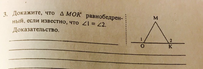 Доказательство: Прямую ОК можно представить виде двух развёрнутых углов, тоесть углов, равных 180 градусов. Первый равен сумме смежных углов(угол1+уголМОК);второй равен сумме смежных углов(угол2+уголМКО). По условию, угол1=углу2, значит угол МОК = углу МКО = 180 градусов - угол1 или угол2. По теореме, равнобедренным называется треугольник с двумя равными углами. Было доказано, что угол МОК = углу МКО, значит треугольник МОК - равнобедренный.
