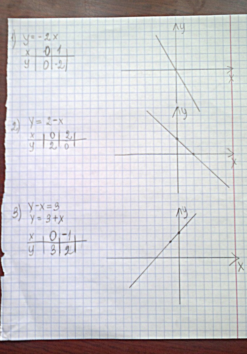 Составте таблицу и постройте по точкам график зависимости, заданной равенством а)у=-2х; б)у=2-х; в)у-х=3.
