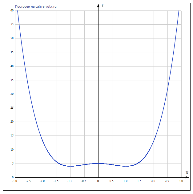 Найдём интервалы, где функция возрастает и убывает, а также минимумы и максимумы функции, для этого смотрим как ведёт себя функция в экстремумах при малейшем отклонении от экстремума:Минимумы функции в точках:x2 = 1 Максимумы функции в точках:x2 = 0 Убывает на промежутках (-oo, 0] U [1, oo) Возрастает на промежутках [0, 1]
