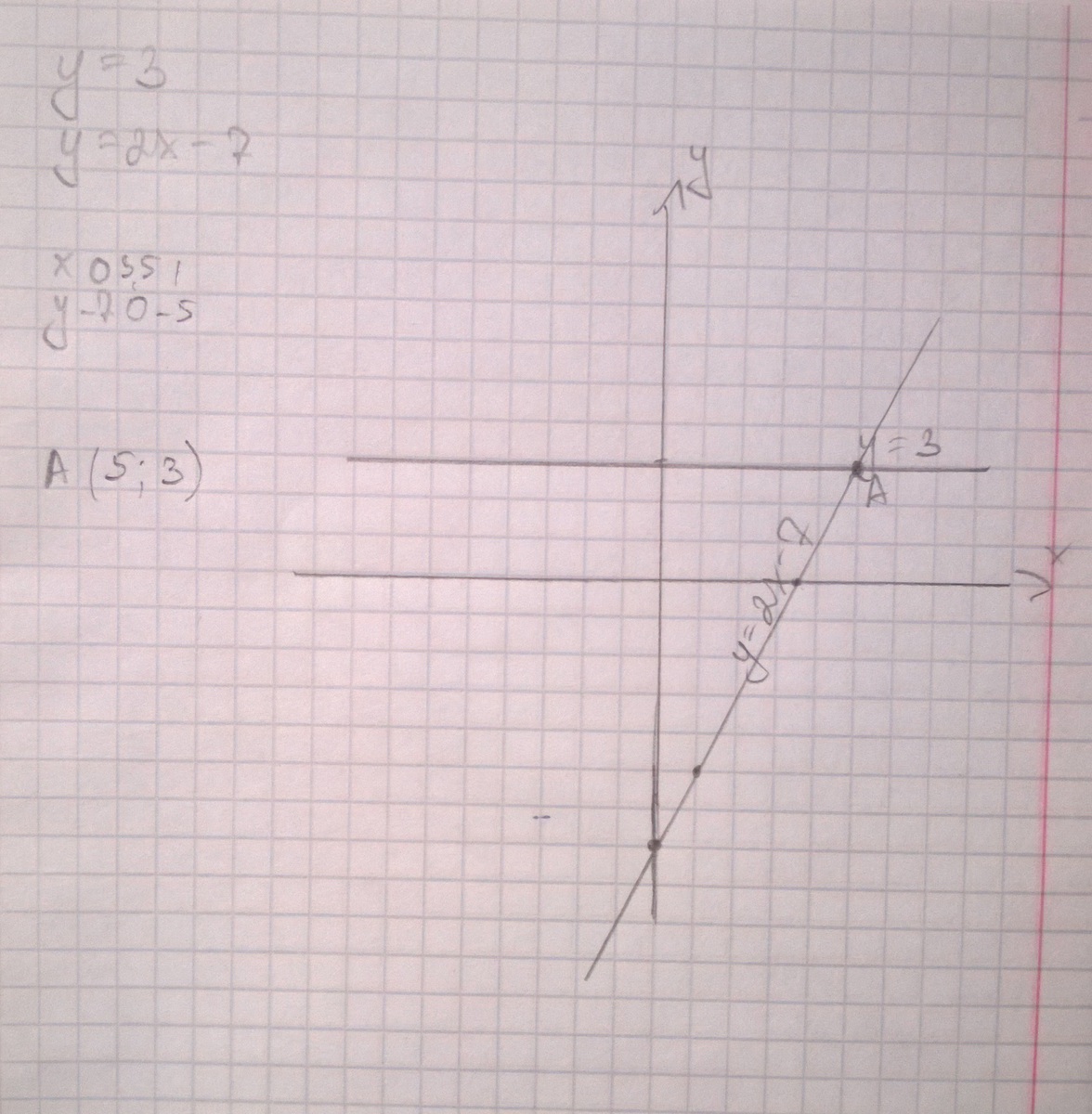 y=3 будет проходить через 3 по оси y. А y=2x-7
