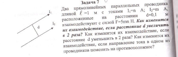 два прямолинейных и параллельных проводника длиной L=1 м. c точками I1= 29 A, I2= 7 A? расположенных на растоянии d=0,1м взаимодействуют с силой F=5 mn Н . Как изменится взаимодействие, если расстояние d увеличить в два раза? Как изменится взаимодействие, если расстояние d уменьшить в два раза? Как изменится взаимодействие, если направление тока в одном из проводников поменять на противоположное