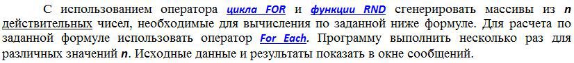 1. Исправьте s=0: for i=1 to n s=s+x(i)/i 2.в выводе цикл не нужен (промежуточные результаты не выводим) 3. Обратите внимание в необходимо использовать For Each(по заданию)