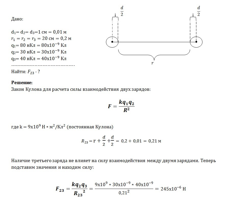 Три медных шарика диаметром 1см каждый расположены в воздухе в вершинах правильного треугольника со стороной 20см.Первый шарик несет заряд q=80 нКл,второй q=30 нКл,а третий q=40нКл.С какой силой второй шарик действует на третий?