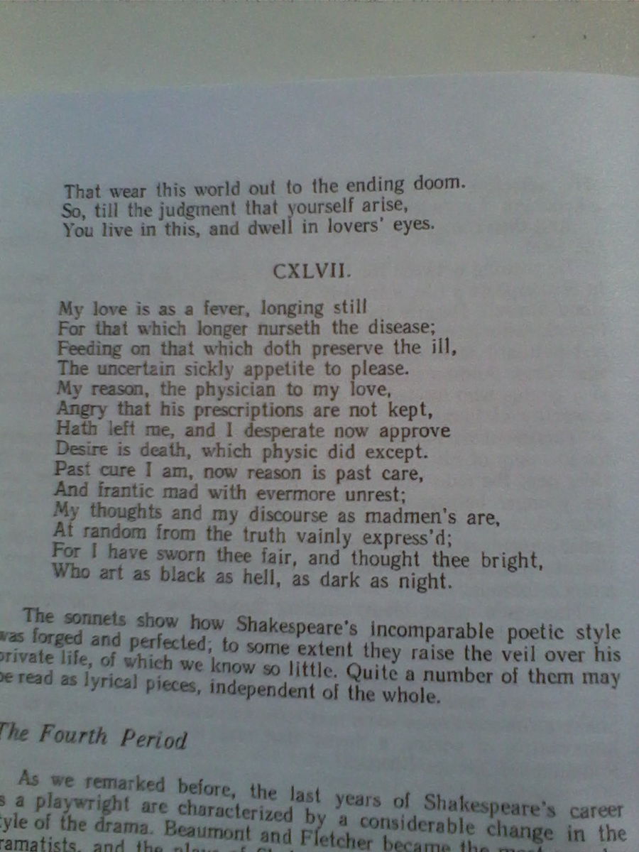 Моя любовь - как лихорадка, которая все время жаждет того, что еще больше вскармливает болезнь, питаясь тем, что сохраняет недуг, чтобы удовлетворить непостоянный, болезненный аппетит. Мой рассудок - врач, лечивший меня от любви, разгневанный тем, что я не выполнял его рецептов, - покинул меня, и теперь я в отчаянье убеждаюсь _на опыте_, что страсть, которую отвергает медицина, - это смерть. Мне уже не излечиться теперь, когда рассудок от меня отказался; я в лихорадочном безумии от вечного смятения, мои мысли и речь - как у безумца, они далеки от истины и говорятся без толку. Так, я клялся, что ты белокура [прекрасна, добра], и думал, что ты светла, а ты черна, как ад, темна, как ночь.