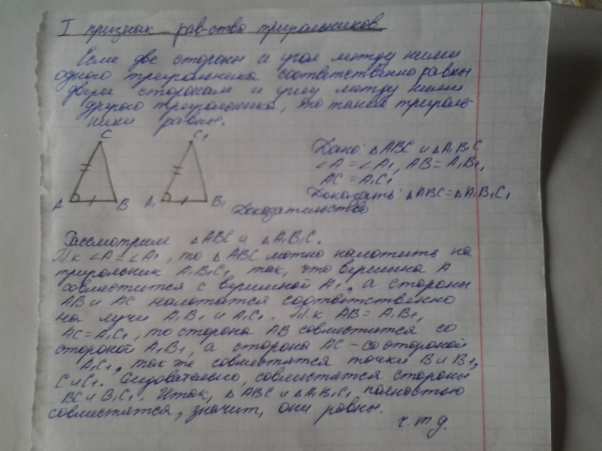 Пришлите пожалуйсто фотку с докозательством теоремы первый признак равенства треугольников,только с черчежом ,дано и докозательством.Очень надо выучит её пришлите пожалуйсто