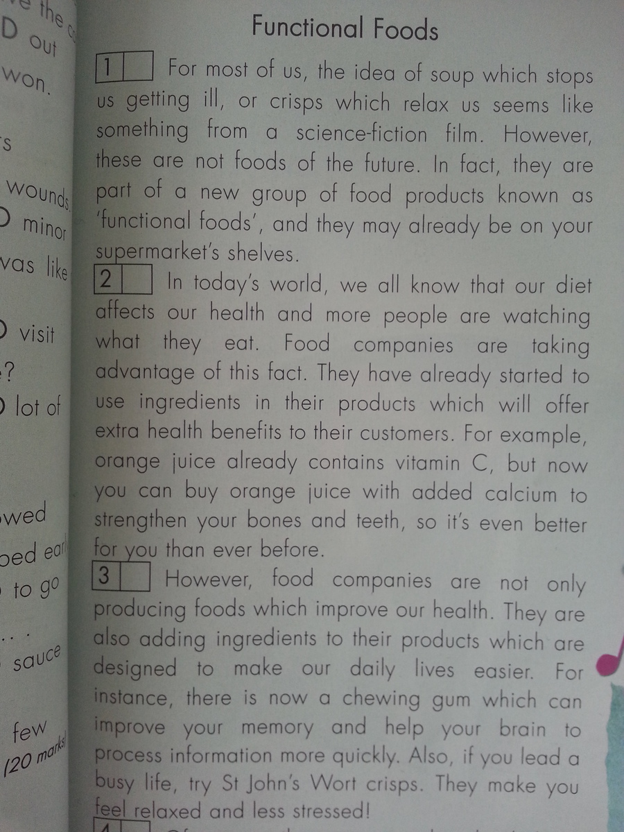Однако, пищевые компании производят не только еду, укрепляющую здоровье. Они также добавляют в свою продукцию ингредиенты, созданные для того, чтобы упростить нашу повседневную жизнь. К примеру, сейчас есть жевательная резинка, которая способна улучшить вашу память и помочь мозгу быстрее обрабатывать информацию. Также, если вы ведете деловую (оживленную/напряженную) жизнь, попробуйте чипсы от St John Wort. Они помогут вам почувствовать себя отдохнувшим и менее напряженным!