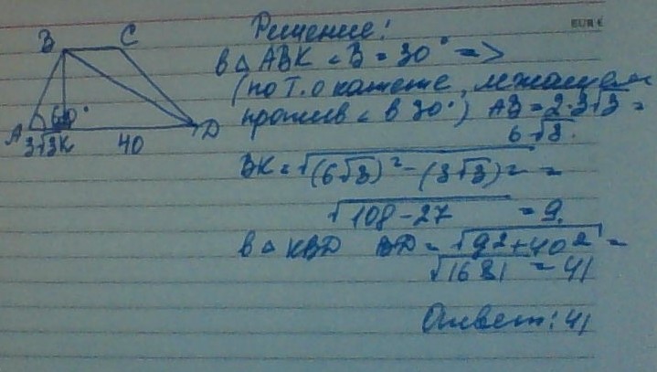 У трапеции ABCD угол BAD=60 градусов,высота BK делит основу AD на отрезки 3√3 и 40 см.Найдите диагональ BD