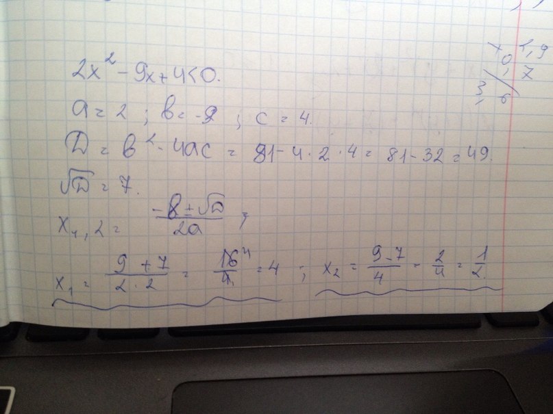 2х в квадрате - 9х + 4 < 0 решить квадратное неравенство