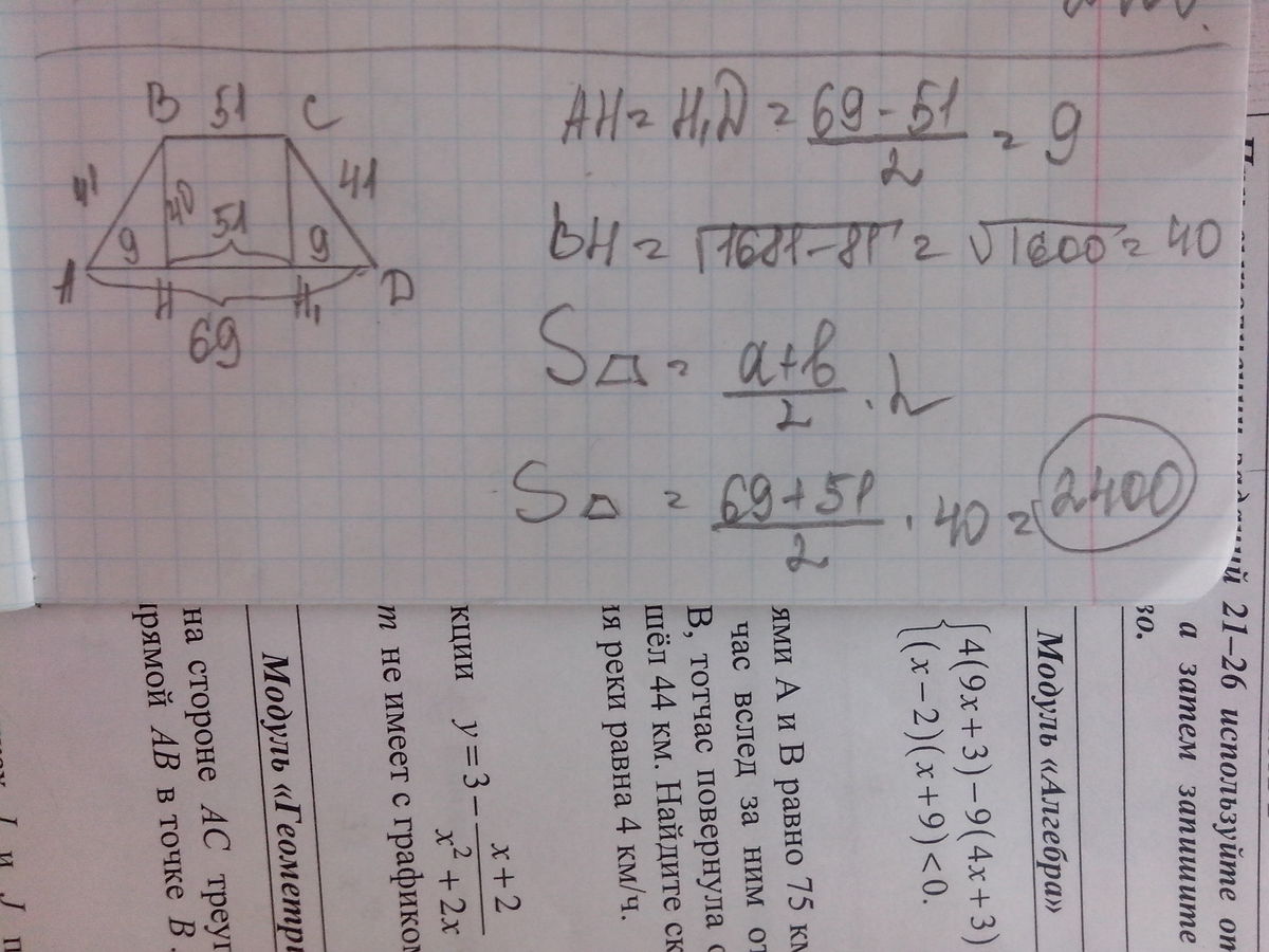 В равнобедренной трапеции основания равны 51 см и 69 см, боковая сторона 41 см. Вычислить площадь трапеции.