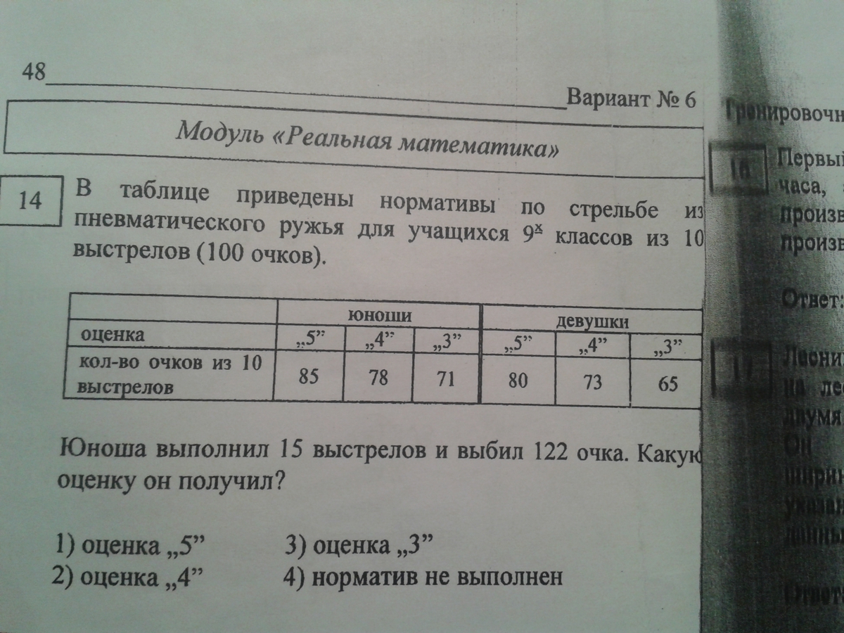 Оценка 3 так как только из 10 выстрелов, а он сделал 15 и выбил 122 очка , если мы от 122 отнимем 50 то получится 72, а 72 - 3