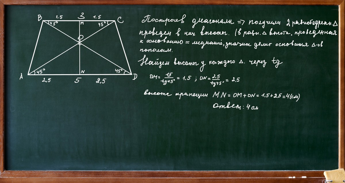 Основи рівнобічної трапеції дорівнюють 3см і 5см,а діагоналі взаємо перепендикулярні . Визначте висоту трапеції
